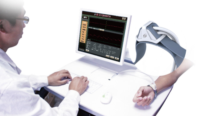 中醫(yī)脈象診斷系統(tǒng):利用計(jì)算機(jī),通過袖帶式傳感器,傳感器自身重量≤50克,在橈動脈寸,關(guān),尺三個(gè)部位檢測脈象信號,模仿中醫(yī)醫(yī)師指法,(傳感器Φ8圓形)更準(zhǔn)確的按照中醫(yī)舉、按、尋的診脈過程,浮、中、沉散布全自動氣體加壓取脈,采集八個(gè)不同壓力段的脈象波形自助選擇佳壓力波形,并將脈象的位,數(shù),形,勢和脈圖的各項(xiàng)參數(shù)自動分析,以判定脈象信息,用于臨床脈象檢測。
